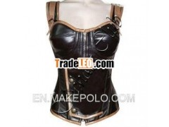 Steam Punk Leather Corset with Cups, Shoulder Straps, Buckles &Steel bones..Fullbust Steampunk Leather Corset with Shouldercstraps &Cups made of High quality Choco Brown cow Leather with Tan LeatherPiping..